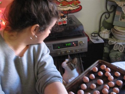 Nicole making our famous sausage balls for Christmas morning. Scout was trying to help.