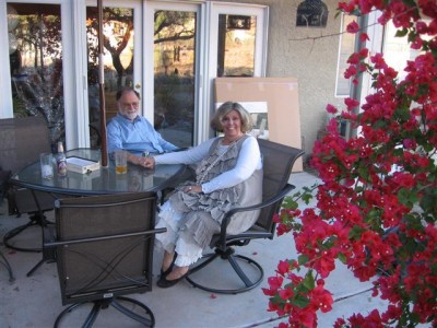 Chuck cooking the asparagus. A great picture of their bougainvillea.