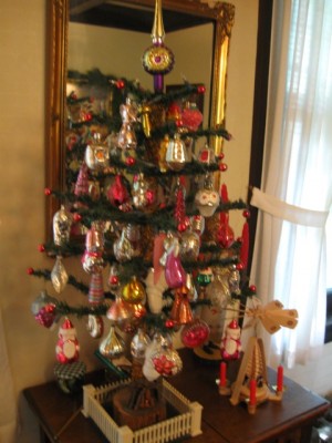 You see the tiny white and red mushrooms? They are glass and they come from Germany. The are the oldest ornaments on this feather tree.